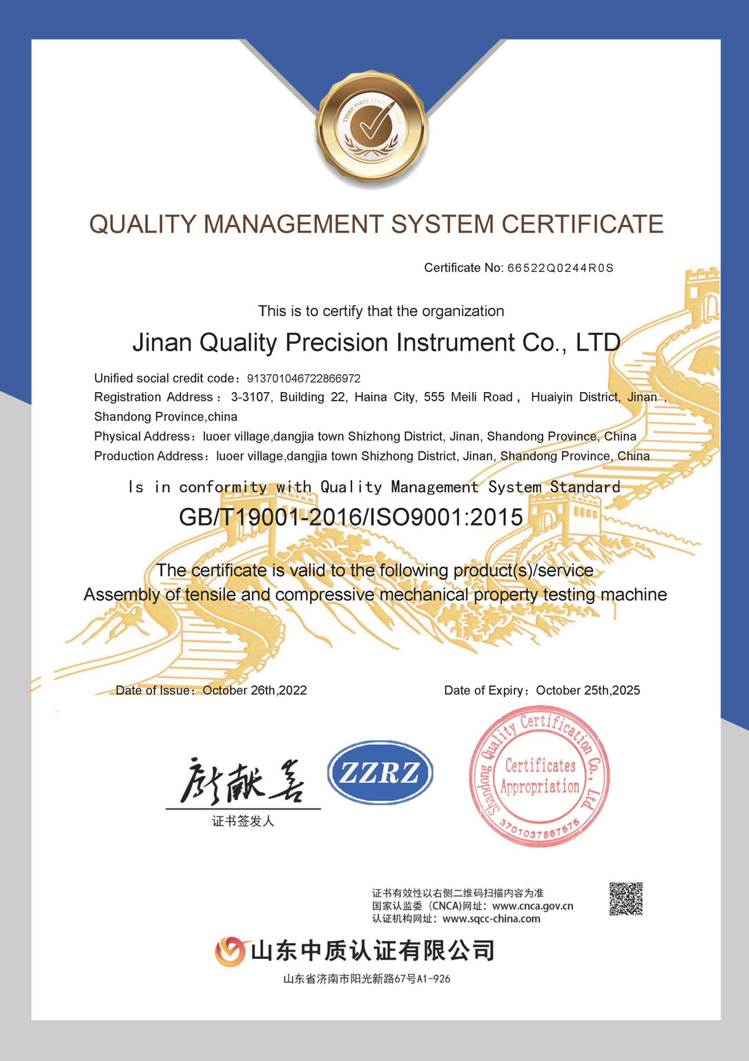 質(zhì)量管理體系認(rèn)證證書